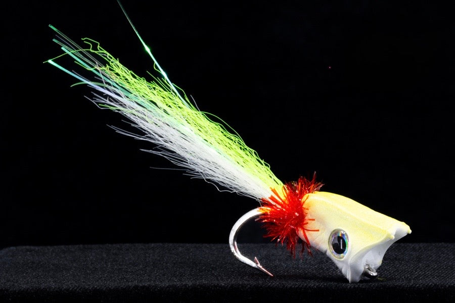 A killer baitfish popper featuring Gnarly Headz popper head. These heads make a great noise when popped but are one of the easiest heads to cast. Also one of the most durable heads on the market! Gone are the days of hitting a rock on a cast and blowing up a popper. These are made of foam, float high, and can take a beating!
