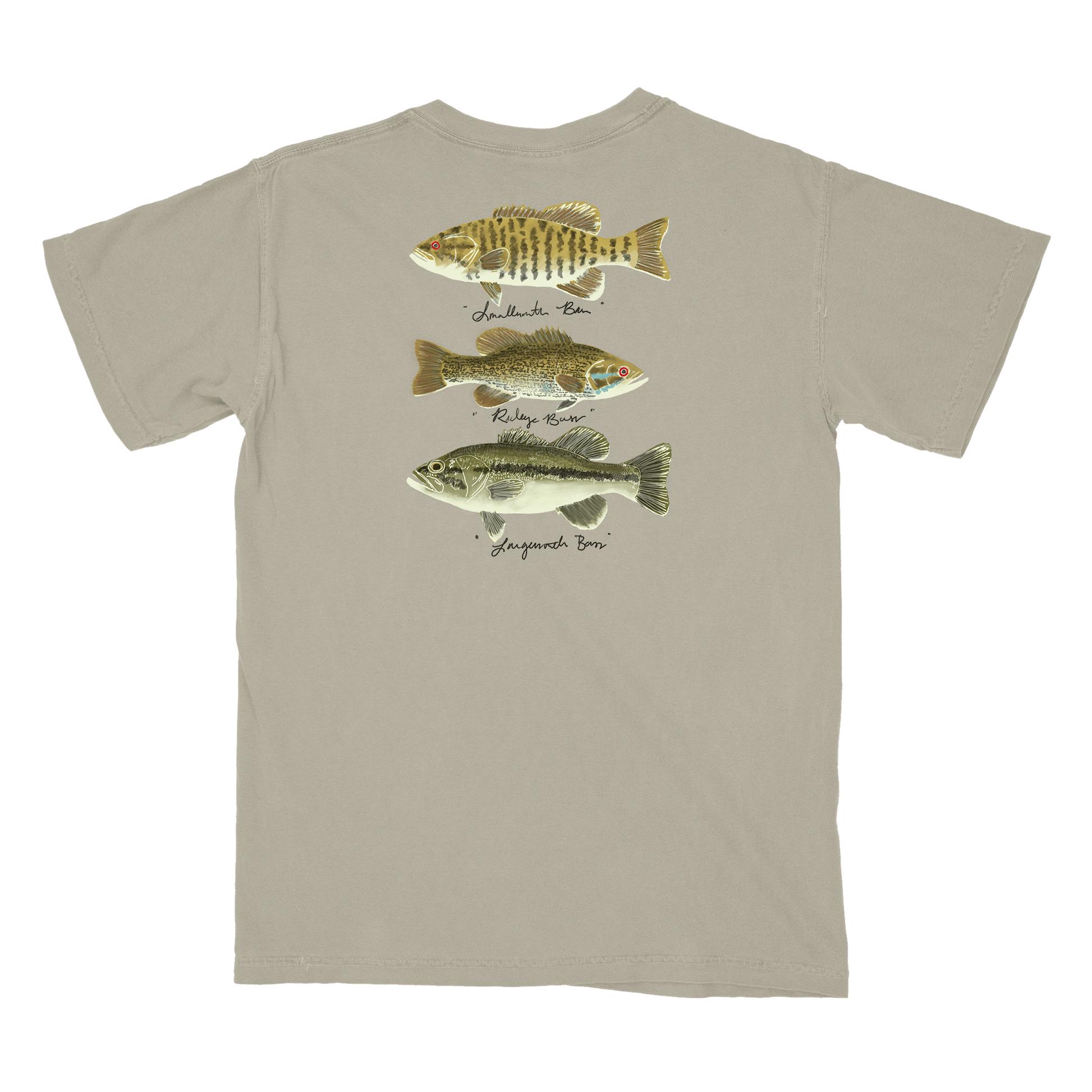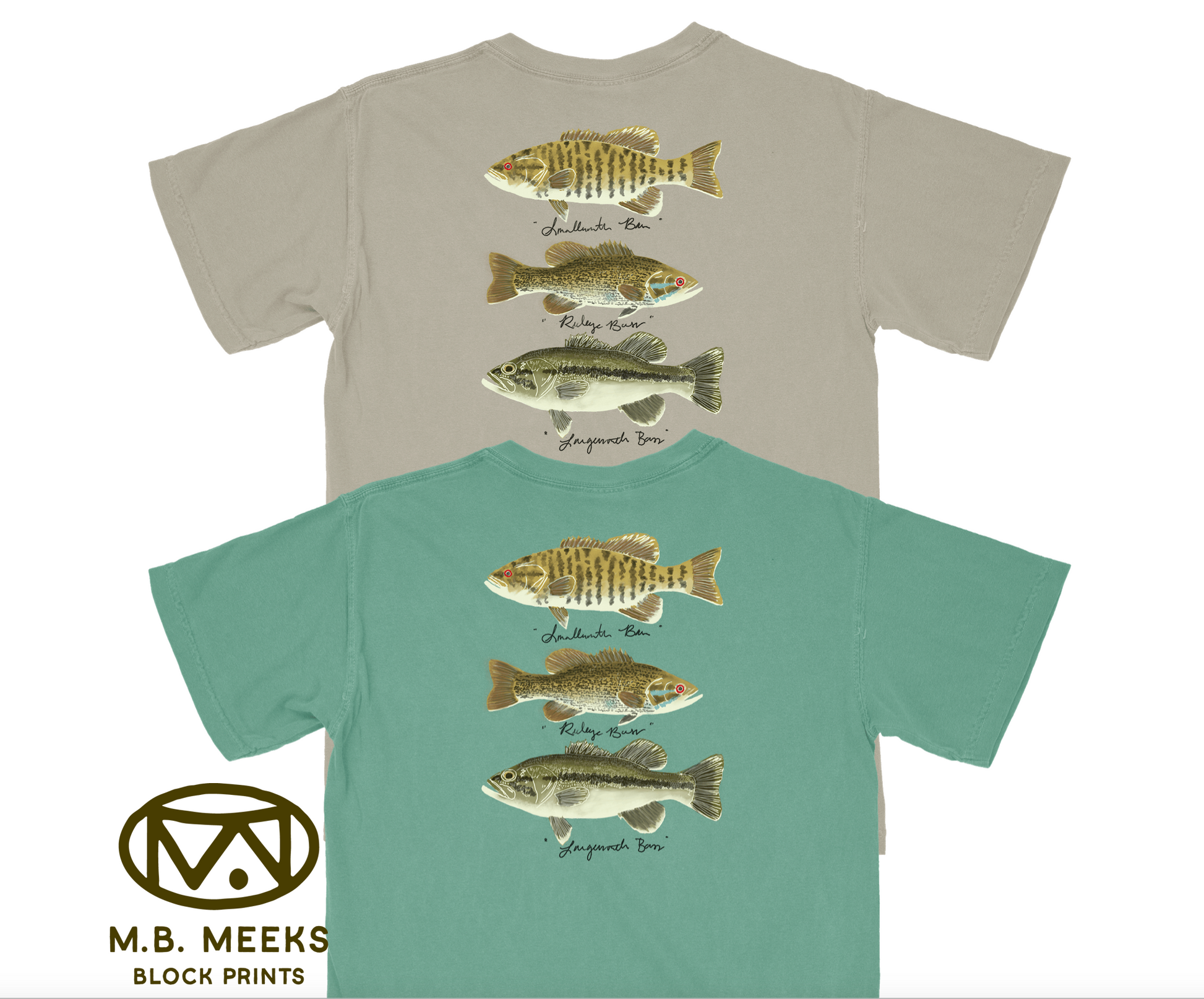 Shirt features a smallmouth, a redeye, and a largemouth.