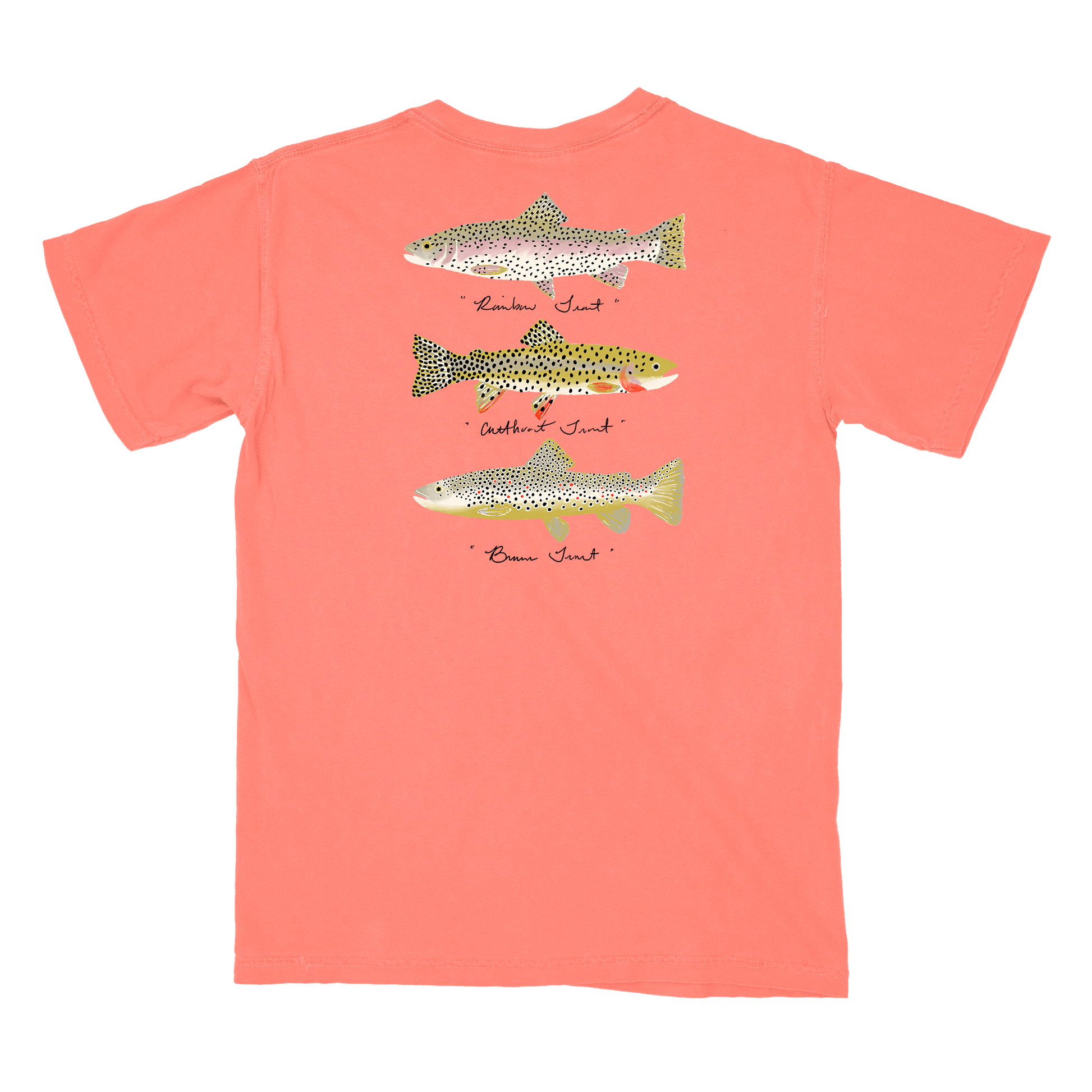 Shirt features a Rainbow, Cutthroat, and Brown Trout