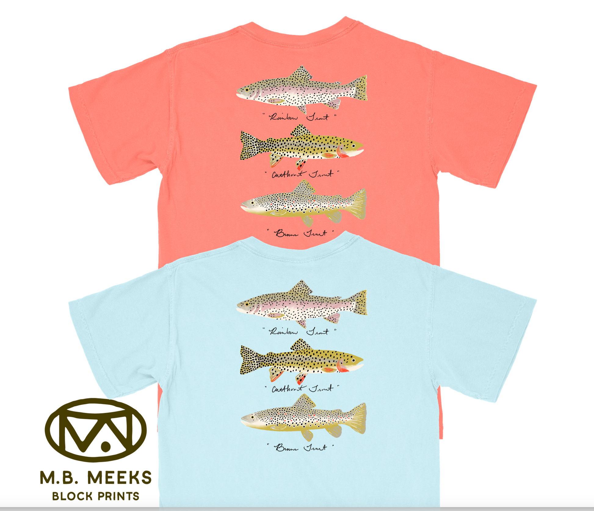 Featuring custom trout art done by MB Meeks Block Prints.